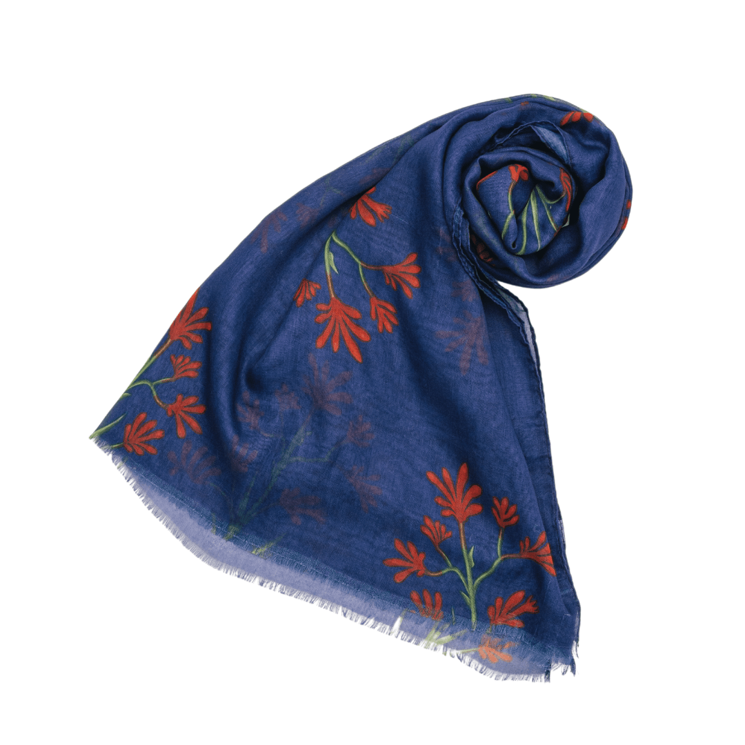 As you may have guessed from the name, this plant features tubular flower covered with dense hairs in a claw-like paw formation. This beautiful Kangaroo Paw scarf highlighted against a navy cotton scarf, which makes the floral print stands out and it compliments any outfit could be proudly worn from day to day. Unlike actual Kangaroos, the Kangaroo Paw doesn't need much care to thrive. It loves sunlight and can grow quickly in the ground or in a container with soil.